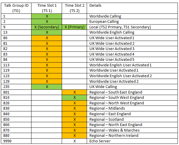 Below is a chart showing a list of talk groups and the time slot these talk groups are used on.